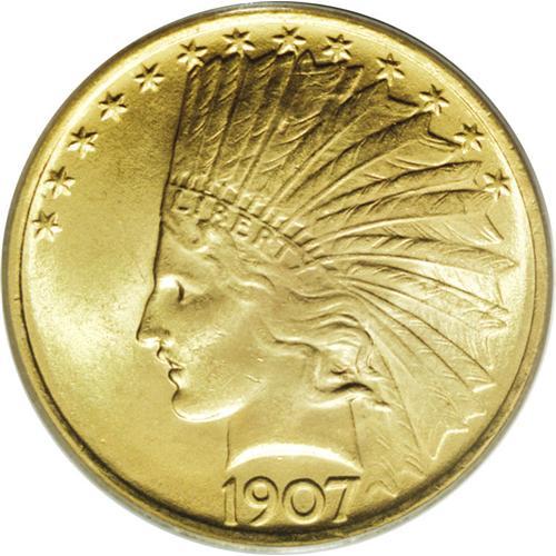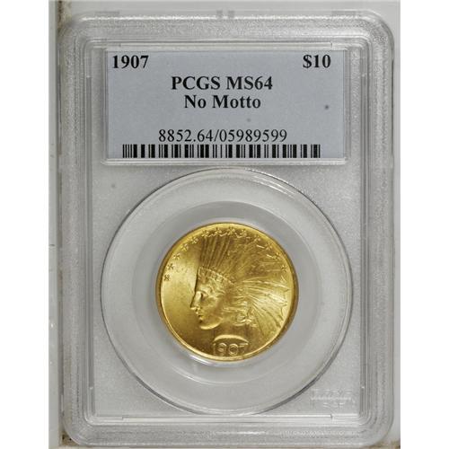 <B>1907 $10 No Periods MS64 PCGS.</B></I> This fully brilliant yellow-gold example is the ideal first year of issue type coin for the Indian Head eagle design. Purists might suggest that one of the Periods varieties is necessarily the proper first year issue, but all of these coins were struck in 1907, thus the example offered here is an excellent choice.<BR><BR><b>Shipping:</b> Coin/Currency (<a target="_blank" href="http://www.heritageauctions.com/common/shipping.php">view shipping information</a>)
