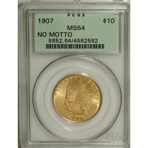 <B>1907 $10 No Periods MS64 PCGS.</B></I> Rich apricot-gold patination tinged with mint-green and lilac envelops both sides of this radiantly lustrous near-Gem. A sharp strike brings out great definition on the design features, including most of the hair and bonnet feathers, areas that are usually weak on this issue. Close scrutiny reveals fewer marks than what might be expected for the grade designation. Housed in a green label holder.<BR><I>From The Vanek Collection.</B></I><BR><BR><b>Shipping:</b> Coins & Currency (<a target="_blank" href="http://www.heritageauctions.com/common/shipping.php">view shipping information</a>)
