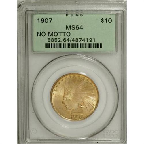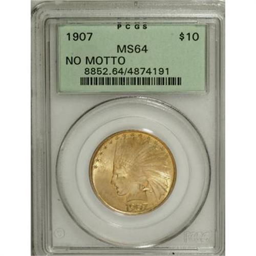 <B>1907 $10 No Periods MS64 PCGS.</B></I> The 1907 ten dollar No Periods, with a mintage of 239,406 pieces, is one of the most available of the Indian Head eagles. Mint engraver Charles Barber made some modifications to Saint-Gaudens' design, including removing the triangular stops or periods, reshaping the branch, and strengthening the feather ends (Jeff Garrett and Ron Guth, 2006). Variegated apricot-gold and mint-green patina resides on the highly lustrous surfaces of this near-Gem, and the design elements are well impressed. Some minute obverse marks define the grade. Housed in a green-label holder.<I><BR>From The Silver Fox Collection.</B></I><BR><BR><b>Shipping:</b> Coins & Currency (<a target="_blank" href="http://www.heritageauctions.com/common/shipping.php">view shipping information</a>)