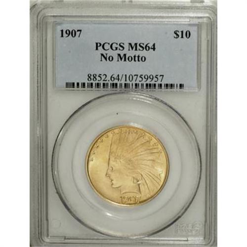 <B>1907 $10 No Periods MS64 PCGS.</B></I> A remarkable example with frosty yellow-gold surfaces, sharp design elements, and fully brilliant luster. The fields are pristine, and the overall appearance is exceptional. While examples are not difficult to locate in Gem quality, this piece should prove a good value when it crosses the auction block.<BR><BR><B>Coin Engraver:</B> Augustus Saint-Gaudens<BR><BR><b>Shipping:</b> Coins & Currency (<a target="_blank" href="http://www.heritageauctions.com/common/shipping.php">view shipping information</a>)