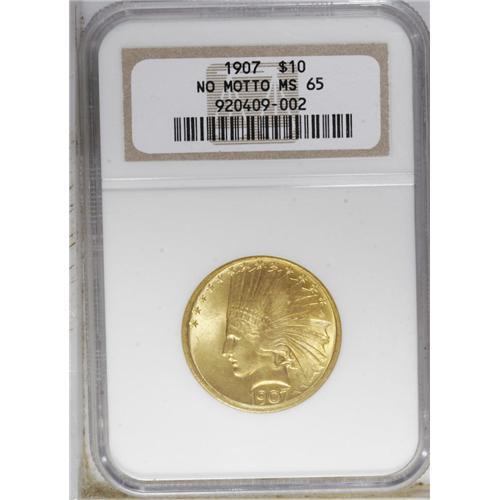<B>1907 $10 No Periods MS65 NGC.</B></I> This radiant Gem features rich orange toning, along with dashes of powder-blue iridescence. The fully lustrous fields exhibit only a couple of moderate marks, and the "sweet spot" of the cheek is unperturbed. Well struck save for the eagle's front claw and a section of the branch beneath.<BR><BR><b>Shipping:</b> Coin/Currency (<a target="_blank" href="http://www.heritageauctions.com/common/shipping.php">view shipping information</a>)