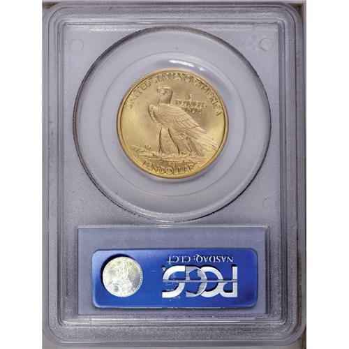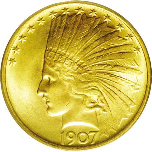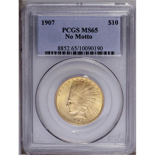 <B>1907<$10> No Periods MS65 PCGS.</B></I> Outstanding mint luster is the first attribute one notices when viewing this outstanding Gem. Sharply defined throughout, the surfaces seem to take on a slight, matte texture because of metal flow toward the rims on each side. Green-golden color overall, a very pleasing example of this popular, first-year issue.