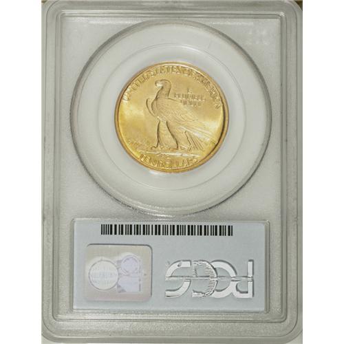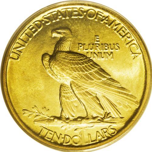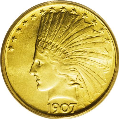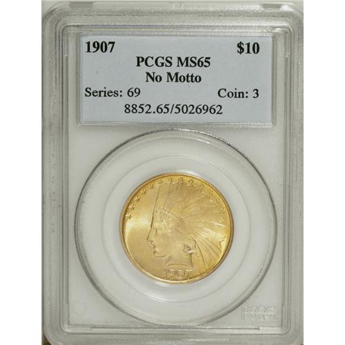 <B>1907 $10 No Periods MS65 PCGS.</B></I> Several varieties were coined in 1907, including this No Periods piece, the most readily available Indian Head eagle of this date. This lovely Gem has exceptional yellow-gold color with brilliant mint frost and wonderful surfaces. Just 65 finer pieces have been certified by PCGS (10/06).<BR><BR><b>Shipping:</b> Coin/Currency (<a target="_blank" href="http://www.heritageauctions.com/common/shipping.php">view shipping information</a>)