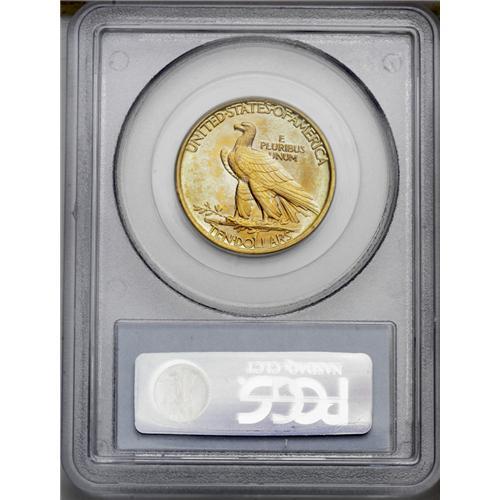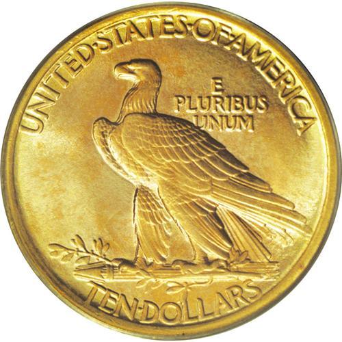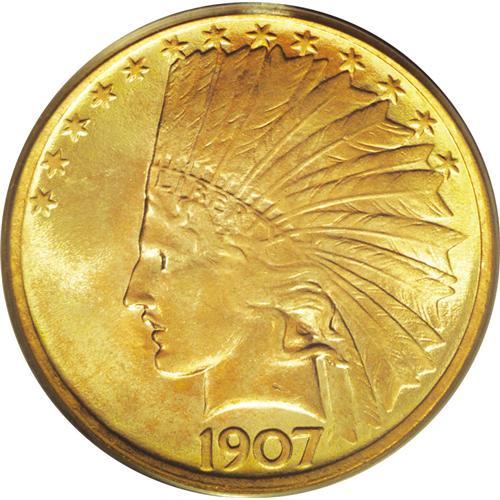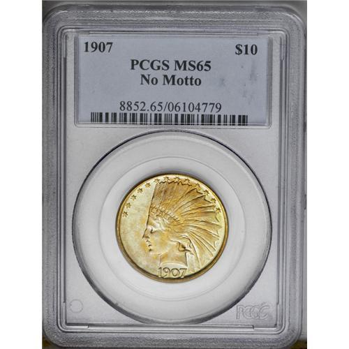 <B>1907<$10> No Periods MS65 PCGS.</B></I> This coin is an uncommonly well preserved representative of this first-year Indian eagle that is relatively easy to obtain in lower grades. Variegated steel-green and rich orange-gold colors envelop fully lustrous, satiny textured surfaces. Both the obverse and reverse are smooth enough to warrant consideration at an even higher grade level, but accuracy compels us to mention a small abrasion on Liberty's lower neck. A very attractive coin, nonetheless, with sharp striking definition for the type.