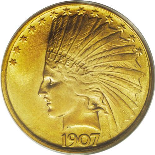 <B>1907 $10 No Periods MS65 PCGS.</B></I> This is the third and final Indian Head eagle dated 1907. Jeff Garrett and Ron Guth, in their <I>Encyclopedia of U.S. Gold Coins, 1795-1933,</B></I> say: "Mint Engraver Charles Barber tinkered with the Saint-Gaudens design and finally came up with this issue. The triangular stops or periods were removed and the branch has a different shape. The ends of the feathers were strengthened, but the central hair and feathers are weaker." Gold specialist Roger Burdette elaborates further: "This last version of the 1907 gold eagle is the one used for production of coins that actually made it into circulation. Dies were prepared from a new set of models provided by the Saint-Gaudens' Estate and approved by Philadelphia Mint engraver Barber. Overall, the design resulted in sharper looking coins."<BR> There is no denying Burdette's last comment, for the Gem specimen in this lot jumps out at the viewer. The luster is vibrant, and the strike is exquisite. Moreover, both sides display rich peach-gold and apricot coloration that is joined on the reverse with tinges of mint-green. Immaculate surfaces reveal just a few minute marks on Liberty's cheek and the eagle, precluding an even higher grade.<BR><BR><b>Shipping:</b> Coins & Currency (<a target="_blank" href="http://www.heritageauctions.com/common/shipping.php">view shipping information</a>)