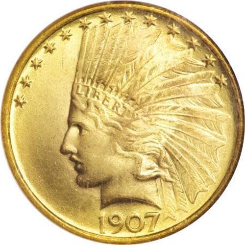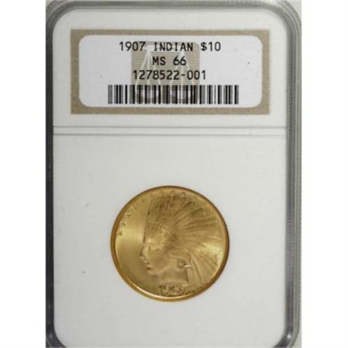 <B>1907 $10 No Periods MS66 NGC.</B></I> After beginning with the old Liberty Head design and continuing through several transitional varieties, in late 1907 it was decided to remove the periods from around E PLURIBUS UNUM on the reverse. The Indian Head eagle design would then continue essentially unchanged through 1933. This No Periods example is a beautiful peach-gold coin, with heavy satin luster visible throughout. The few noticeable surface marks do not detract from the abundant eye appeal and are in line with the assigned grade. The strike is a bit weak in the center of the obverse, as is normal for this date. A remarkable example of Saint-Gaudens' Indian Head design.<BR><BR><B>Coin Engraver:</B> Augustus Saint-Gaudens<BR><BR><b>Shipping:</b> Coins & Currency (<a target="_blank" href="http://www.heritageauctions.com/common/shipping.php">view shipping information</a>)