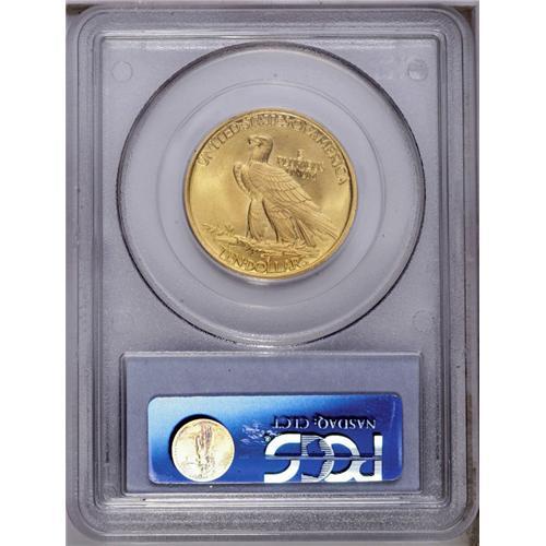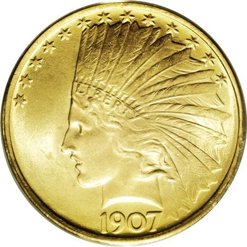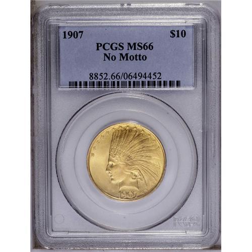 <B>1907<$10> No Motto MS66 PCGS.</B></I> Heritage is privileged to offer a second example of this variety in the nearly unsurpassed MS66 grade, in addition to the example in the Duckor Collection. The frosty luster is nearly unbroken on this superlative Premium Gem specimen, excepting a couple of tiny grazes on the highpoints and a light scrape in the left (facing) reverse field. The golden surfaces have a light gray patina in the fields that extends to the rims. For pedigree purposes, a tick just before the hair on the cheekbone is noted, along with a wispy pinscratch, visible only when the coin is tilted "just so," on the jawline. Mentioning these distractions lends them more importance than they are due, for this coin remains a problem-free example of this popular type. Population: 54 in 66, 5 finer (3/06). <BR><BR><B>Important notice:</B> Heritage usually auctions material at the rate of 200-250 lots per hour. On some occasions eBay Live bid software or the Internet may not be able to keep up with the pace of the auction. We recommend placing a realistic absentee bid now as insurance to avoid disappointment. Occasionally the auctioneer may eliminate or reject an eBay Live bid, and the auctioneer may also reopen a lot after the close of the eBay live bidding (usually because we missed an audience bid), and may reject your bid even if it shows you as the winning bidder. By bidding via eBay Live, you agree that Heritage may award the lot to another bidder at its sole discretion under the circumstances described above or any other reasonable circumstances. Since eBay bids are not shown to us until we open the lot on the floor, we treat those bids just like floor bids. In most cases the floor responds before the eBay bid is presented to us, due to Internet lag time, so for consistency we have made it a policy that floor bids are always considered first over tie eBay live bids. Also please note that all Heritage lots purchased through eBay Live carry a 20% Buyer's Premium. Please make sure you read the Terms and Conditions before you bid. This lot is being auctioned in conjunction with a live floor auction by Heritage Galleries & Auctioneers. All final auction and invoice information will be supplied by Heritage Galleries & Auctioneers, and all other information should be considered preliminary. Lot:4099 <BR><BR><B>Winning Notification and Billing:</B> After the FINAL session in this auction is complete, Heritage will send e-mail and snail mail invoices. This process normally takes several days. All final auction and invoice information will be supplied by Heritage Galleries & Auctioneers, and all other information should be considered preliminary. <BR><BR>This auction will be conducted on a live auction floor and over the Internet through eBay Live. If you choose to place an absentee bid, please take a moment to <font color='#0000ff'><u><a href='http://pages.ebay.com/liveauctions/help/before/laabsentee.html'>learn how eBay Live absentee bidding works</a></u></font><font color='#000000'>