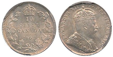 1907 10¢ PCGS MS66. Superb strong lustre under hue of gold and pink.