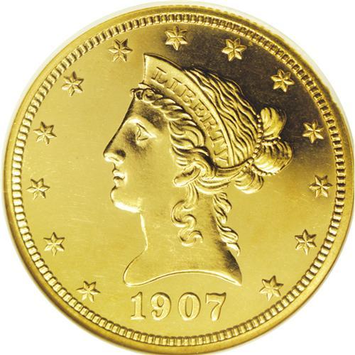 <B>1907 $10 PR64 NGC.</B></I> This is the final year of mintage for the proof Liberty eagle and the lowest mintage of the 20th century. The piece's status as a proof is confirmed by the exquisitely and deeply mirrored fields, orange peel surfaces, and sharply struck devices. A significant amount of contrast exists between the devices and the fields, giving a nice black-and-white (or black-and-gold) effect when examining the coin from straight on, but apparently not quite enough to justify a Cameo designation. The Choice grade appears to be determined by a few pinpricks in the fields, and belies the more than ample eye appeal this coin possesses.<BR><BR><b>Shipping:</b> Coin/Currency (<a target="_blank" href="http://www.heritageauctions.com/common/shipping.php">view shipping information</a>)