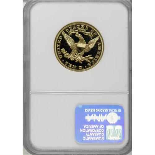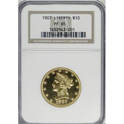 <B>1907 $10 PR65 NGC.</B></I> Only 74 proof Liberty eagles were produced in this, the final year of Gobrecht's long-lived design. With an extant population estimated to be only 25-30 pieces, this is one of the scarcer proof Liberty eagles produced in the 20th century. As such, gold specialists can anticipate greater difficulty in locating a desirable 1907 than a survivor from either the 1900, 1902, or 1904 deliveries. The remarkable specimen offered in this lot projects a near-cameo effect, where the devices appear to float over deeply reflective, watery fields. The design elements are exquisitely struck, with virtually no area displaying softness. Bright golden-orange color dominates essentially blemish-free surfaces on both obverse and reverse. Census: 4 in 65, 1 finer (11/07).<BR><I>From The Madison Collection.</B></I><BR><BR><B>Coin Engraver:</B> Christian Gobrecht<BR><BR><b>Shipping:</b> Coins & Currency (<a target="_blank" href="http://www.heritageauctions.com/common/shipping.php">view shipping information</a>)