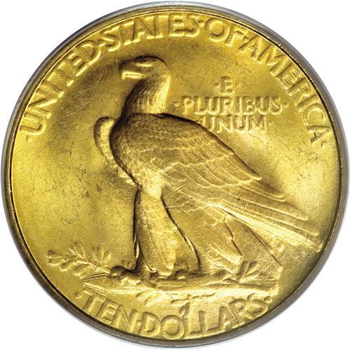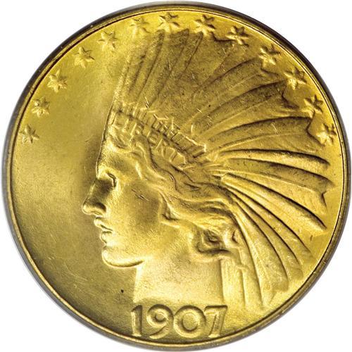 <B>1907 $10 Rolled Edge MS65 PCGS.</B></I> August Saint-Gaudens was commissioned by President Theodore Roosevelt to create new coinage designs, and his creations for the eagles and double eagles are considered to rank among the most beautiful designs in the entire panorama of American coinage. For the eagle, he chose a female bust to represent Liberty, with the addition of a headdress emblematic of the American Indian. Initially, it was Saint-Gaudens concept to use this design on the larger double eagle, and a single example was produced. Today, the former Judd-1776 (renumbered to Judd-1905) pattern double eagle is one of the most famous pattern issues in private hands. <BR> Two versions of his famous Indian design were prepared, differing in their style of edge. The first of these coins was the so-called Wire Rim variant with a pronounced knife rim, and the second version had a normal or Rolled Rim that would allow stacking of the coins in commerce. For many years these two variants were described by the misnomer Knife Edge or Rolled Edge. Both variants had periods before and after the legend and denomination on the reverse, thus their additional misnomer: the Periods Type. These design elements are more properly triangular-shaped pellets aligned with the center of the letters, although less than full strikes give the appearance of round dots. Charles Barber retained these same designs for circulation strike coinage, and a small quantity was produced just before revised models arrived from the Saint-Gaudens estate in Cornish, New Hampshire.<BR> It is only due to a stern letter from President Roosevelt that the Wire Rim coins even exist. The President demanded that coins should be struck no later than September 1, 1907, thus dies for the Wire Rim coins were pressed into service. Approximately 500 of those coins were struck, followed by a large production of 31,500 Rolled Rim coins, all deemed by Philadelphia Mint Superintendent John Landis to be inferior. He ordered the coins to be melted, but Assistant Treasury Secretary John Edwards vetoed that decision and order the coins to be released. At about the same time, Frank Leach arrived in Philadelphia to assume the role of Mint Director, and Leach supported the early decision by John Landis to have the coins melted. It was obviously important for the new incoming Mint Director to support his subordinate's decision. Leach had previously served as the Superintendent of the San Francisco Mint, and had his own considerable experience with public demand for coinage. Just 50 examples were saved from the melting pot and distributed to museums and important private collections, such as the Garrett and Woodin collections. After all of the various circumstances took place regarding the prototype coins, regular production began late in the year, utilizing the new models and the No Motto coins were struck.<BR> This example ranks among the finer pieces that still survive, with just three better ones handled by us over the past 14 years. The profile of Liberty and the headdress fill nearly all of the center and right half of the coin, with the date below and 13 stars above. The balance of the obverse is an open field, with extensive swirling die polish lines, as often seen on the related High Relief double eagles. The reverse has an eagle facing left, grasping an olive branch and bundle of arrows, with the motto E PLURIBUS UNUM in the upper right field, the legend UNITED STATES OF AMERICA above, and the denomination TEN DOLLARS below. The surfaces have brilliant and frosty yellow-gold luster with only a few scattered marks on each side. Like the obverse, the reverse fields are entirely filled with swirling die polish lines. The design elements on both sides are nicely detailed, but not overly sharp with slight weakness evident among the tips of the feathers in the headdress and on the eagle's legs. This is an amazing and majestic gold piece, ranking among the 100 best U.S. coin issues according to Jeff Garrett and Ron Guth, sure to see intense bidding competition when it crosses the auction block. Population: 13 in 65, 16 finer (4/07).<BR><BR><b>Shipping:</b> Coins & Currency (<a target="_blank" href="http://www.heritageauctions.com/common/shipping.php">view shipping information</a>)