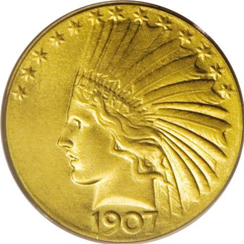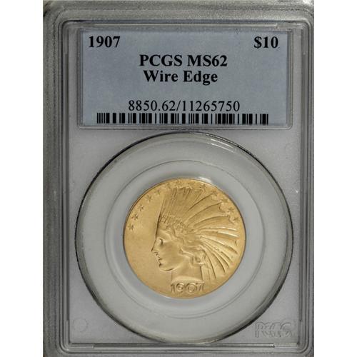 <B>1907 $10 Wire Rim MS62 PCGS.</B></I> This remarkable Mint State example has highly lustrous greenish yellow-gold surfaces with satiny luster and some khaki toning on the higher points of the design. Historically, the Wire Rim eagles have been classified as pattern coins, but today they are considered to be an integral part of a complete set of regular issue coinage. Jeff Garrett and Ron Guth called these pieces "the initial concept coins that most perfectly represent Augustus Saint-Gaudens's idea for this coin." They continued to note that "all examples were struck and given out to dignitaries and VIPs." As a result, nearly all pieces were saved and remain in existence today.<BR><BR><b>Shipping:</b> Coins & Currency (<a target="_blank" href="http://www.heritageauctions.com/common/shipping.php">view shipping information</a>)