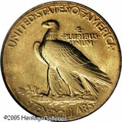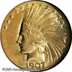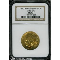 <B>1907 $10 Wire Rim MS63 NGC.</B></I> The name Wire Rim stems from the delicate, knife-like rim that surrounds both sides of these coins. This feature is the result of metal that was forced between the collar and the dies during striking as the coins were not originally designed with a rim. The wire rim on both sides had the potential to interfere with the ejection process, and it also caused stacking problems. After Mint officials determined the Wire Rim ten to be impractical as a regular production coin (because of the wire rim itself), the design was modified by Charles Barber, the result being the very scarce Rolled Edge variety, which eventually evolved into the standard No Periods type. The Wire Rim ten is widely recognized as a pattern, but it is also collected as a part of the regular series, with a status that is analogous to the 1856 Flying Eagle cent. Of the original 500 pieces struck, it is thought that perhaps 50% to 60% still exist today. This is a rich orange-gold example that is sharply defined throughout. The surfaces display the normal brightness that is common to all Wire Rim tens, a result of the very fine die polishing marks in the fields. There are no mentionable contact marks on either side of this lovely coin.<BR><I>Purchased from Abner Kreisberg Corporation on April 24, 1981 for $15,000.</B></I><BR><I>From The Beverly Hills Collection.</B></I> Lot:8846