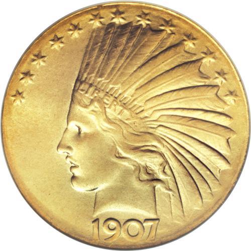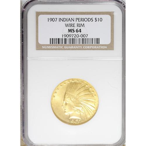<B>1907 $10 Wire Rim MS64 NGC.</B></I> Many numismatists feel that the 1907 Periods, Wire Rim eagles most perfectly represent Augustus Saint-Gaudens' concept for this coin. Jeff Garrett and Ron Guth, in their <I>Encyclopedia of U.S. Gold Coins,</B></I> provide some background information on the noted sculptor's first attempt to execute an Indian Head design on American gold coinage:<BR><BR> "Saint-Gaudens felt that the heroic standing figure of Liberty should be placed only on the larger double eagle, and hence chose to show only her head and neck, and modeled Liberty after his own rendition of Nike (Victory) from the famous General Sherman Monument (1905). President Theodore Roosevelt demanded that a Native American war bonnet be added to Liberty, a fanciful object for either Liberty or a Native American woman to wear."<BR><BR> The initial ten dollar gold coins displayed a pronounced knife-like or "wire" rim, sometimes referred to as a "fin," rather than a normal flat rim. Roger Burdette, in his recent book <I>Renaissance of American Coinage, 1905-1908,</B></I> sums up the problems that Chief Engraver Charles Barber foresaw resulting from this feature:<BR><BR> "As Barber pointed out, the fin, created by metal flowing between the face dies and edge collar, was a major problem. Aesthetically, it made the coins look rough and irregular. The greater difficulty, however, was loss of gold as the fin quickly wore off. Ten and twenty dollar coins were used primarily in large transactions and international settlements. When gold coin was exported, the cost of gold in New York was based on the face value of the coin, rather than weight. If new coins could be secured, they were nearly as satisfactory to ship as bars. (Gold coin was bought from the Treasury at face value, and credited in Europe according to weight.) However, in the case of coin that had been in circulation or was not otherwise of full weight, the banker had to receive a higher rate for his overseas drafts against the shipment than in the case of bars. Consequently, if the coins had a fin, which quickly wore off, the shipper in the United States was paying for something he didn't get. The only solution was to obtain a higher rate of exchange on drafts sold against the gold. Any perception by bankers that the new-design coins were underweight could have had severe financial repercussions on international trade."<BR><BR> Five hundred 1907 Wire Rim ten dollar coins were reportedly struck before being replaced with the Flat or "Rolled" Rim variety. Because of their novelty as a first-year issue and beautiful design, many were saved from circulation, and sold at face value to officials, museums, and collectors. Nearly 500 Wire Rim examples have been graded by NGC and PCGS, some of which are obviously resubmissions.<BR> The MS64 example in the present lot displays the yellow-gold satiny finish typical for the issue, that in this case is tinted with traces of light green. The luster is outstanding, and a well-executed strike has resulted in sharp definition on the design features. Light die polish lines are noted in the reverse fields, and a minute alloy spot is visible at 9 o'clock on the reverse rim. Some unobtrusive marks on the first couple of bonnet feathers are the only mentionable "flaws" evident on this marvelous specimen. Indeed, in our opinion, this coin has been conservatively graded by NGC.<BR><BR><b>Shipping:</b> Coins & Currency (<a target="_blank" href="http://www.heritageauctions.com/common/shipping.php">view shipping information</a>)
