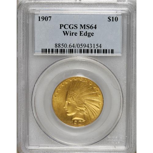 <B>1907 $10 Wire Rim MS64 PCGS.</B></I> After a 10-year stint as superintendent of the San Francisco Mint, Frank A. Leach moved to Washington in 1907 to become director of the U.S. Mint. The heroic performance of Leach and other San Francisco Mint employees during the devastating great earthquake and fire of 1906, an excellent record at the San Francisco facility, and political activism for the Republican Party led to his recommendation by the previous director, George E. Roberts, and his acceptance by Treasury Secretary George Cortelyou. Leach was nominated in August and took office on November 1, 1907.<BR> In the interim, Robert Preston served as acting director. Due to President Roosevelt's desire for small quantities of the experimental designs to be available to collectors and because of Roberts' fear that an extremely small emission would create an instant rarity on the order of the 1804 silver dollar, the Wire Rim pieces were produced to the extent of about 500 pieces. The first strikes of the high relief Saint-Gaudens eagle coinage are thought to be the purest representation of the sculptor's artistic vision for this coin, before the design was compromised by the necessities of mintage practicality, with perhaps a dash of the bitter jealousy and obstructionism of Mint Engraver Charles Barber. In that regard, the Wire Rim tens are the younger sibling of the Ultra High Relief double eagle coins, and they are technically patterns as well, never intended for circulation but produced to give an idea of how far artistic freedom could stretch.<BR> None of the Wire Rim tens circulated to any degree, as all were sold to collectors, museums, and administration officials, and accordingly most are found in high grade. All examples show prominent die polishing marks in the fields, which must not be mistaken for hairlines. This piece offers softly glowing yellow-gold surfaces, and the obverse is exceptionally clean for the grade. A couple of small contact marks are noted in the left reverse field, directly in front of the eagle's beak. This coin overall, however, has a premium appearance and will form the centerpiece of an advanced collection of 20th century gold.<BR><BR><b>Shipping:</b> Coins & Currency (<a target="_blank" href="http://www.heritageauctions.com/common/shipping.php">view shipping information</a>)