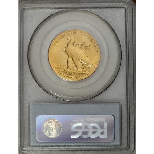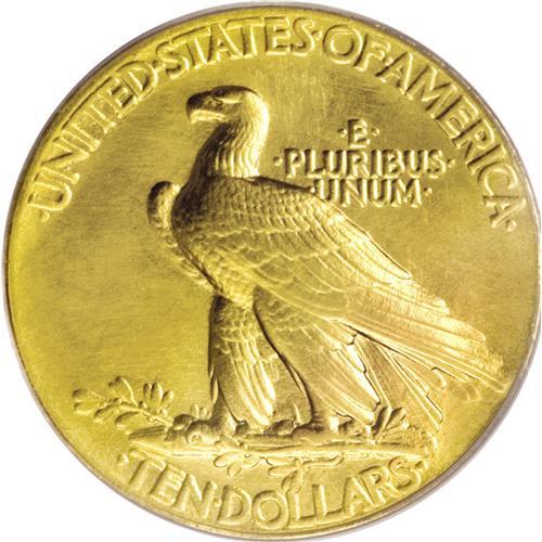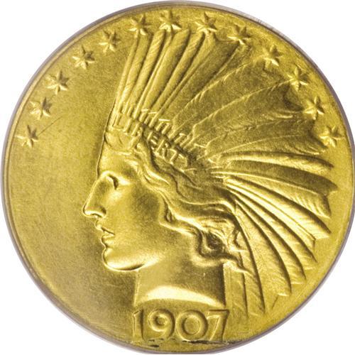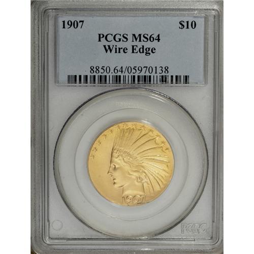 <B>1907 $10 Wire Rim MS64 PCGS.</B></I> This impressive near-Gem specimen provides a glimpse of the artistic genius of Augustus Saint-Gaudens. Like the amazing Ultra High Relief double eagles, this design clearly shows the exact appearance of the Indian eagles as the sculptor intended. Unlike later issues with their reduced design depth, the Indian on the obverse and the eagle on the reverse are masterfully treated. Total production of this issue is now believed to be 542 coins, including 500 that were struck during the summer and another 42 coins in December. Five years later, 129 pieces remained in Treasury vaults, with 59 of those sold for $15 each and the remaining 70 coins melted, resulting in a net mintage of 472 coins.<BR> This piece has highly lustrous and brilliant satin surfaces with rich green-gold color. The lower obverse has a planchet imperfection through the date with faint file marks along the lower left obverse border. We believe that these file marks were created in an attempt to reduce the appearance of additional planchet streaks, probably within the Mint before this example was released. The fields, especially on the reverse, show extremely heavy die polishing lines, at first glance resembling hairlines, but actually the result of fine lines in the surface of the die. Many examples of this issue were poorly treated over many years by non-collectors, with a large number of impaired pieces still existing. Those with excellent surfaces such as this coin are highly desired today.<BR><BR><b>Shipping:</b> Coins & Currency (<a target="_blank" href="http://www.heritageauctions.com/common/shipping.php">view shipping information</a>)