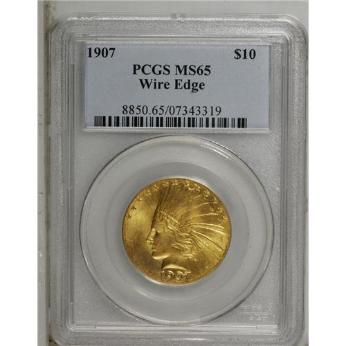 <B>1907<$10> Wire Rim MS65 PCGS.</B></I> This is a Gem quality representative of the famous Indian Head design created for the ten dollar gold piece by Augustus Saint-Gaudens. The model for the head of Liberty on this piece is not known to the present generation, but it probably derived from several sources. Homer Saint-Gaudens, the designer's son, commented that "the profile head was modeled from a woman supposed to have negro blood in her veins. Who, other than an Indian, may be a 'pure American' is undetermined. In reality here, as in all examples of my father's ideals sculpture, little or no resemblance can be traced to any model; since he was always quick to reject the least taint of what he called 'personality' in such instances."<BR> Cornelius Vermeule discussed this topic in <I>Numismatic Art in America:</B></I> "The tale about a woman of negro blood serving as the ultimate source for the head of Liberty on the ten-dollar coin may be correct in that artists had constant recourse to living models, but there is a clear line of classical progression from the so-called 'Beautiful Head' made at Pergamon about 165 B.C. to the Nike of the Sherman Monument and thence to the coins. The sculptures at Pergamon had been excavated in the previous generation, and they were artistic sensations of the decades when Saint-Gaudens was at the height of his fame and creativity."<BR> Only 15 finer examples of this issue have been certified by PCGS (9/06). It is a sharply struck Gem with finely granular surfaces that were imparted at the time it was minted. The reverse has considerable die polish in the fields that impart a satiny appearance. Both sides are fully brilliant with a hint of green over bright yellow surfaces.