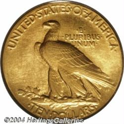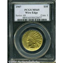 <B>1907<$10> Wire Rim MS65 PCGS.</B></I> A special 1907 Indian eagle issue that is sometimes described and listed as a pattern issue, although these were almost certainly not intended as a pattern coinage at the time of issue. The so-called Wire Rim eagles, sometimes also described as "knife rim" coins, were the first of this design issued during the year, and represented the exact design as intended by Augustus Saint-Gaudens. Total mintage was approximately 500 coins.<BR> This is a satiny greenish-gold Gem with exceptional aesthetic appeal. The surfaces are extremely attractive with the special look that is created by extensive die polish lines in the fields. These finishing lines are especially prominent on the reverse. <BR><BR><B>Important notice:</B> Heritage usually auctions material at the rate of 200-250 lots per hour. On some occasions eBay Live bid software or the Internet may not be able to keep up with the pace of the auction. We recommend placing a realistic absentee bid now as insurance to avoid disappointment. Occasionally the auctioneer may eliminate or reject an eBay Live bid, and the auctioneer may also reopen a lot after the close of the eBay live bidding (usually because we missed an audience bid), and may reject your bid even if it shows you as the winning bidder. By bidding via eBay Live, you agree that Heritage may award the lot to another bidder at its sole discretion under the circumstances described above or any other reasonable circumstances. Since eBay bids are not shown to us until we open the lot on the floor, we treat those bids just like floor bids. In most cases the floor responds before the eBay bid is presented to us, due to Internet lag time, so for consistency we have made it a policy that floor bids are always considered first over tie eBay live bids. Also please note that all Heritage lots purchased through eBay Live carry a 20% Buyer's Premium. Please make sure you read the Terms and Conditions before you bid. </span></font></tr></table></td></tr></table>