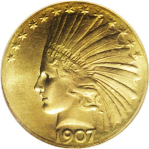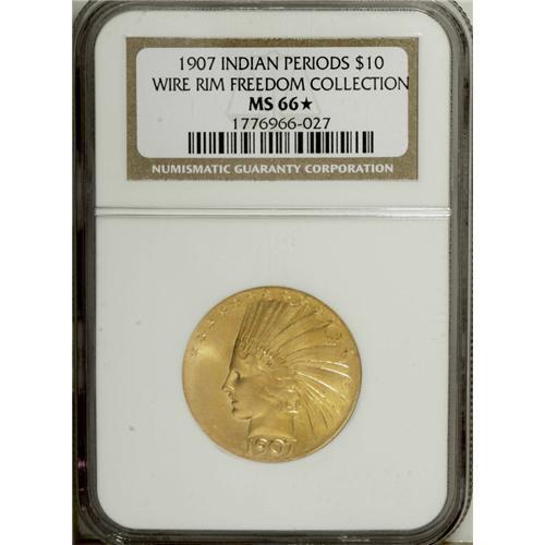 <B>1907 $10 Wire Rim MS66 <img border='0' src='http://www.heritagecoins.com/images/star.gif' width=10 height=10> NGC.</B></I> Breen-7094. The Wire Rim pieces are technically patterns (Judd-1774), as they were never intended for circulation. The Breen <I>Complete Encyclopedia</B></I> (1988) says that "Almost all survivors are UNCs. distributed to officials and VIPs." Designed with triangular dots for periods and a "knife" or wire rim, these rare pieces show another distinction: Breen adds that " Saint Gaudens's standing-eagle device is splendid in its original form, reminiscent of late Egyptian and early Roman work at its best, though it is seen in untampered form only in the rare experimental pieces <B>reen-7094 to -7096 ." The eagle treads upon an olive branch and strikes a truculent, powerful pose, with an aggressive expression that says it is competent to deal with any threat.<BR> The obverse design is more compromised. Were it not for President Theodore Roosevelt's insistence that Augustus Saint-Gaudens place an unlikely Indian war bonnet on the female head, this design would likely be called the Nike Head or Victory Head: It is based on "General Sherman Led by Victory," a bronze statue at the entrance to New York's Central Park that took Saint-Gaudens 11 years to complete.<BR> Doubt lingers as to whether these pieces, with a mintage of about 500 examples, were struck in proof format or not. A February 1907 letter from Mint Superintendent Frank Landis, cited in Taxay's <I>U.S. Mint and Coinage,</B></I> mentions 50 proof pieces, but Breen's proof <I>Encyclopedia</B></I> calls any purported examples "so rare in proof as to be controversial." The more recent Garrett-Guth gold <I>Encyclopedia</B></I> makes no mention of confirmed proof examples, citing the Smithsonian's finest piece as an "MS-66." Our own experience with this issue also leads us to doubt that true proof examples exist, and neither NGC nor PCGS has certified any proofs. The present specimen is one of 30 MS66 coins currently certified at NGC and PCGS combined, which have graded 11 pieces finer (10/06).<BR> This is an absolutely amazing coin. The surfaces have a thick, frosted finish, quite unlike the bright satiny luster usually seen. Also, Wire Rim tens usually have a bright yellow-gold finish, but this piece has rich reddish-orange coloration. Each side is also remarkably well preserved--one could literally count the number of contact marks on one hand that are present on this piece. While finer examples have been certified, it is difficult to imagine a coin with stronger eye appeal, thicker mint luster, and fewer obvious marks.<BR><I>From The Freedom Collection.</B></I><BR><BR><b>Shipping:</b> Coin/Currency (<a target="_blank" href="http://www.heritageauctions.com/common/shipping.php">view shipping information</a>)