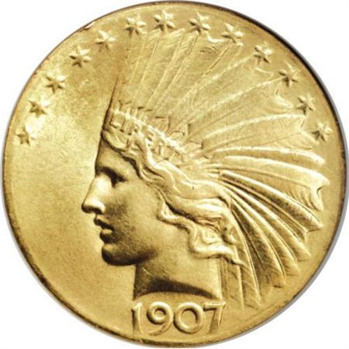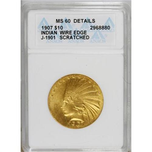 <B>1907 $10 Wire Rim--Scratched--ANACS. MS60 Details.</B></I> Judd-1901, formerly Judd-1774. The Wire Rim ten is generally acknowledged today to be a pattern issue. It was a first and unsuccessful effort to produce the Saint-Gaudens design for the new ten dollar gold coins. The coins were considered to have an indistinct appearance, and the design was soon changed to the even more unacceptable Rolled Rim variant. Finally, the Mint hit upon the regular issue that continued to the end of the design in 1933. This is a crisply struck coin with the usual bright yellow-gold surfaces. The singular distraction is a shallow scratch that extends from the obverse rim at 2:30 to almost 8 o'clock.<BR><BR><b>Shipping:</b> Coins & Currency (<a target="_blank" href="http://www.heritageauctions.com/common/shipping.php">view shipping information</a>)