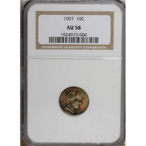 <B>1907 10C AU58 NGC.</B></I> NGC Census: (18/235). PCGS Population (17/307). Mintage: 22,220,576. Numismedia Wsl. Price for NGC/PCGS coin in AU58: $71. (#4842)<BR><BR><B>Coin Engraver:</B> Charles E. Barber<BR><BR><b>Shipping:</b> Coins & Currency (<a target="_blank" href="http://www.heritageauctions.com/common/shipping.php">view shipping information</a>\)