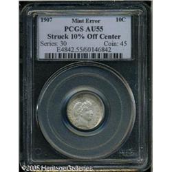 <B>1907 10C  Barber Dime--Struck 10% Off Center--AU55 PCGS.</B></I> Struck off center toward 7 o'clock, the date is approximately 40% off the flan. This lightly toned piece nonetheless briefly circulated before it was saved by a sharp-eyed individual.<BR><I>From The Lonnie Gray Collection of Error Coins.</B></I>    Lot:10974
