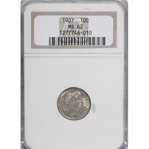<B>1907 10C MS62 NGC.</B></I> NGC Census: (34/204). PCGS Population (64/237). Mintage: 22,220,576. Numismedia Wsl. Price for NGC/PCGS coin in MS62: $117. (#4842)<BR><BR><B>Coin Engraver:</B> Charles E. Barber<BR><BR><b>Shipping:</b> Coins & Currency (<a target="_blank" href="http://www.heritageauctions.com/common/shipping.php">view shipping information</a>)