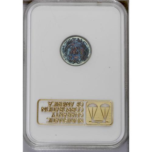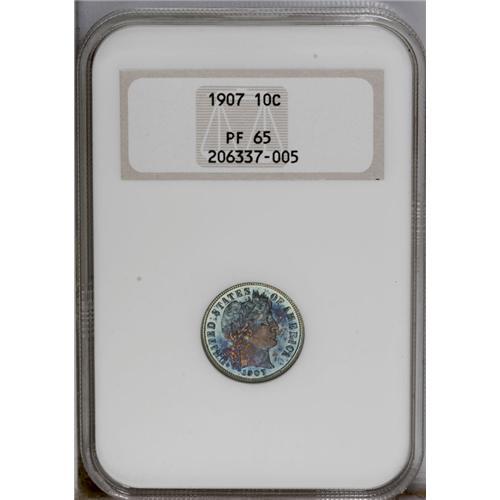 <B>1907<10C> PR65 NGC.</B></I> Glossy fields display deep navy-blue, orange, and ruby-red patina. Meticulously struck and carefully preserved. Another low mintage date in the proof Barber dime series; only 575 pieces coined. In an early generation holder. Census: 34 in 65, 41 finer (3/06).
