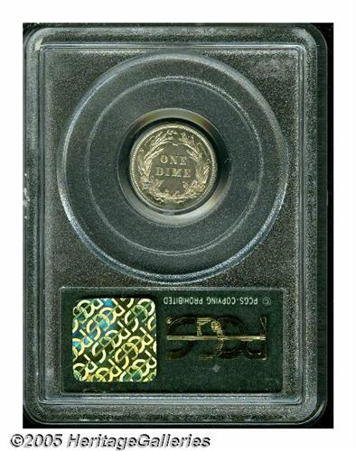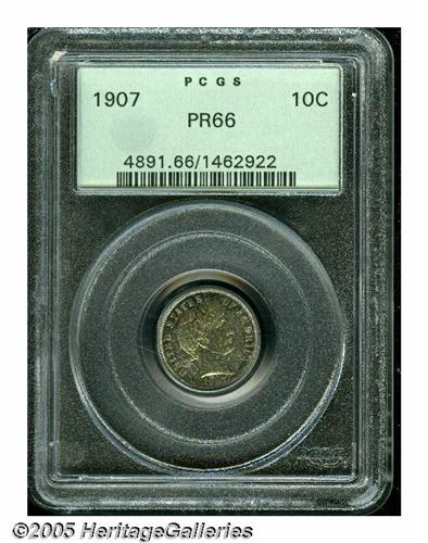 <B>1907<10C> PR66 PCGS.</B></I> Speckled gold and violet toning covers the obverse in particular, yet bright mirror luster shines through. Well struck, and free of notable imperfections. Population: 21 in 66, 9 finer (6/05).