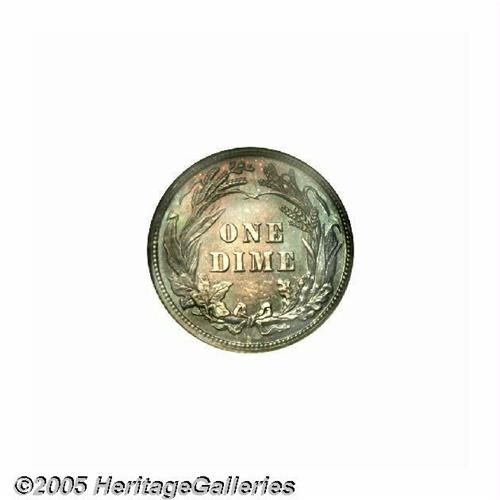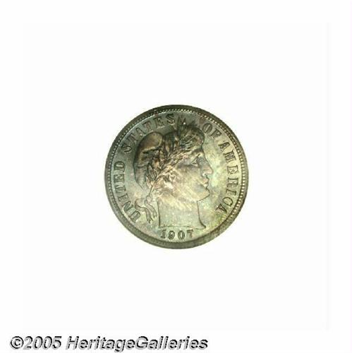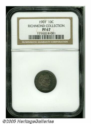 <B>1907<10C> PR67 NGC.</B></I> Ex: Richmond Collection. A very special proof type coin, this piece shows deeply reflective proof mirrors in the fields and both sides are covered with gorgeous sea-green and deep crimson-rose toning. A one-of-a-kind coin that must be seen to be fully appreciated. Population: 13 in 67, none are finer (5/05).