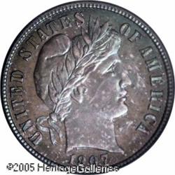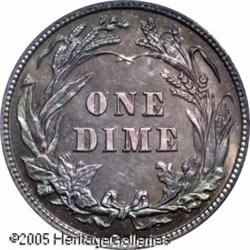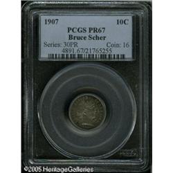 <B>1907 10C PR67 PCGS.</B></I> The centers are toned in milky steel-violet and orange shades, while flashes of turquoise iridescence dominate the outer portions. Both the originality and the Superb quality of this mesmerizing proof Barber are clearly on display. Population: 7 in 67, 1 finer (1/05).<BR><I>From the Bruce Scher #1 All-Time PCGS Registry Set.</B></I> Lot:4067