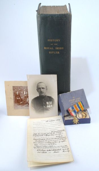 Items collected by 8794 Sergeant William Webb of the Royal Irish Rifles including History of the Royal Irish Rifles by George Brenton Laurie, Gale & Polden 1914 with contemporary inscription on front paste-down "C Company 2nd Royal Irish Rifles Tidworth 1914" and later notation "The above was written by Captain J. C. Bowen-Colthurst". Bowen-Colthurst was infamous for his ordering summary executions including Francis Sheehy Skeffington during the 1916 Rising. Also discharge wallet and documents noting Webb's service details including his shrapnel wound suffered at Aisne in September 1914 which later forced his discharge from the army, miniature 1914 Star Trio with bar, group photograph of solders with Webb seated centrally, pc photograph showing Webb post-war with service medals, related cabinet card photograph showing a member of the Royal Irish Constabulary, 'Echo of the 1916 Rebellion pamphlet, Royal Ulster Rifles Association Report 1934, Royal Army Medical Corps manual 1904 and assorted newspaper clippings mostly relating to the Royal Irish Rifles. (10 items)