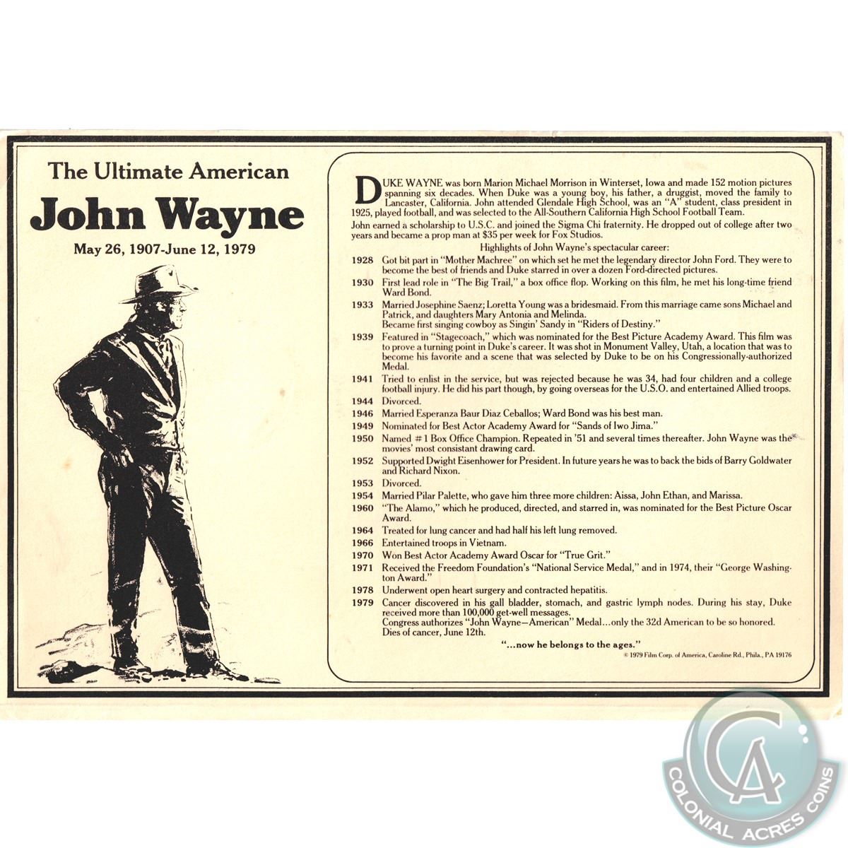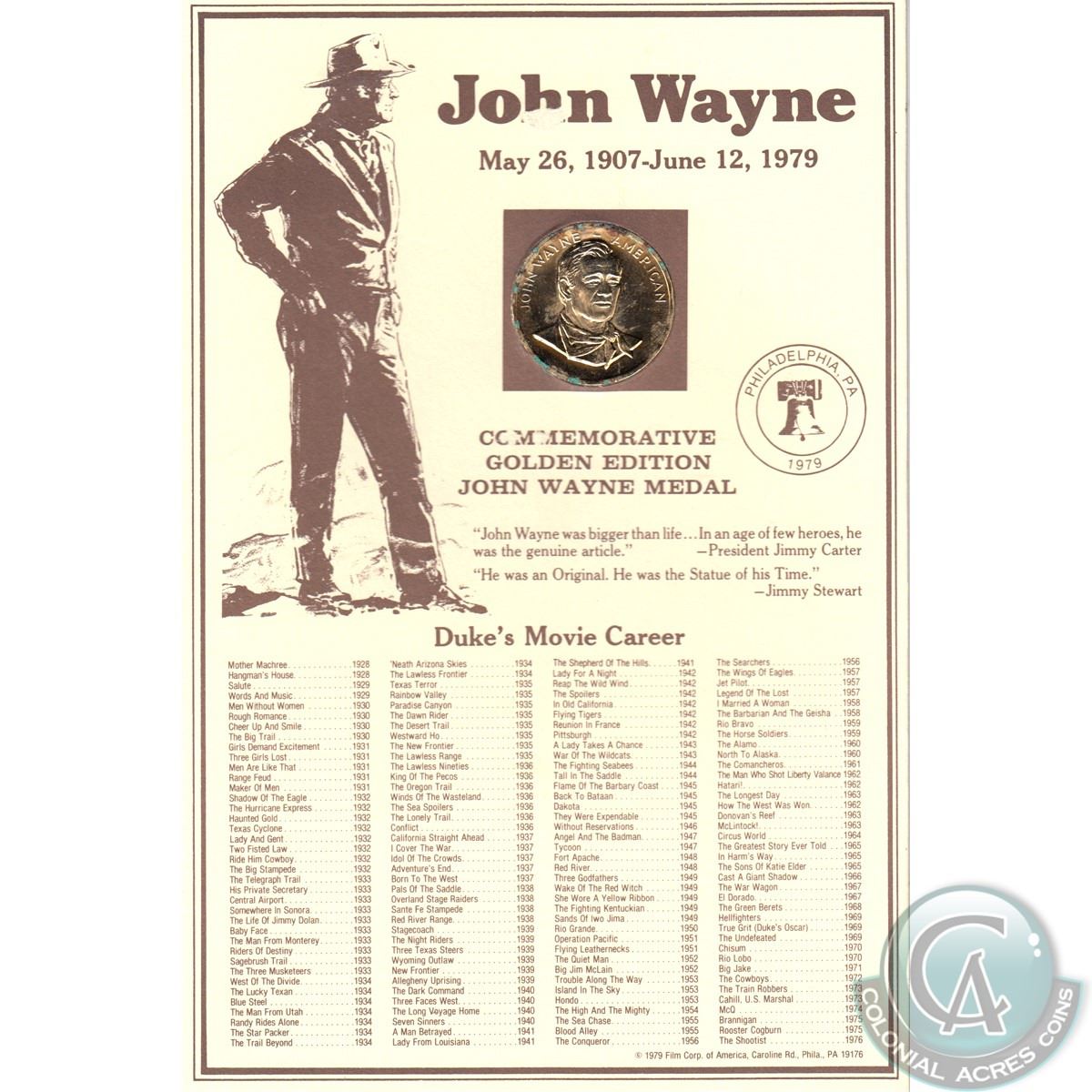1907-1979 Commemorative Golden Edition John Wayne Medal. Comes in hard cardboard outlining the Duke's movie career with COA from The American Treasury Mint. Please note there is green corrosion on one side of the Medallion.