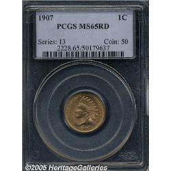 <B>1907 1C MS65 Red PCGS.</B></I> Vibrant luster radiates from coppery-gold surfaces. The grade is defined by light marks on the Indian's cheek and neck.