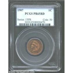1907 1C PR65 Red PCGS. Bright gold color, with a small blush of rose hues on the reverse border at 4 o'clock. A boldly struck Gem that has pleasing reflectivity in the fields. Seemingly as struck aside from a short and wispy handling mark on the upper obverse. Population: 14 in 65, 15 finer (10/02). Important notice: We expect to be auctioning lots at the rate of 200-250 per hour. Sometimes eBay Premier live bid software cannot keep up with that pace, so we strongly recommend that you place a realistic proxy bid now as insurance to avoid disappointment. Also please note that all Heritage/CAA lots purchased through eBay Premier carry a 20% Buyer's Premium. Please make sure you read the Terms and Conditions.