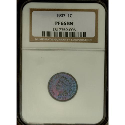 <B>1907 1C PR66 Brown NGC.</B></I> Electric blue and magenta-violet dance on the lively surfaces of this Premium Gem, walnut-brown at the base. A boldly impressed and highly appealing late-date proof. Census: 6 in 66 Brown, 1 finer (11/06).<BR><BR><b>Shipping:</b> Coin/Currency (<a target="_blank" href="http://www.heritageauctions.com/common/shipping.php">view shipping information</a>)