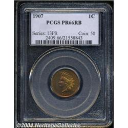<B>1907<1C> PR66 Red and Brown PCGS.</B></I> Vibrant rose-red, honey-gold, and aqua iridescence endows this gorgeous and seemingly flawless premium Gem. Although struck in substantial numbers for the era, most proof Indian Cents are spotted and do not approach the eye appeal of the present specimen. Population: 7 in 66 Red and Brown, 2 finer (3/04). <BR><BR><B>Important notice:</B> Heritage usually auctions material at the rate of 200-250 lots per hour. On some occasions eBay Live bid software or the Internet may not be able to keep up with the pace of the auction. We recommend placing a realistic absentee bid now as insurance to avoid disappointment. Occasionally the auctioneer may eliminate or reject an eBay Live bid, and the auctioneer may also reopen a lot after the close of the eBay live bidding (usually because we missed an audience bid), and may reject your bid even if it shows you as the winning bidder. By bidding via eBay Live, you agree that Heritage may award the lot to another bidder at its sole discretion under the circumstances described above or any other reasonable circumstances. Since eBay bids are not shown to us until we open the lot on the floor, we treat those bids just like floor bids. In most cases the floor responds before the eBay bid is presented to us, due to Internet lag time, so for consistency we have made it a policy that floor bids are always considered first over tie eBay live bids. Also please note that all Heritage lots purchased through eBay Live carry a 20% Buyer's Premium. Please make sure you read the Terms and Conditions before you bid.