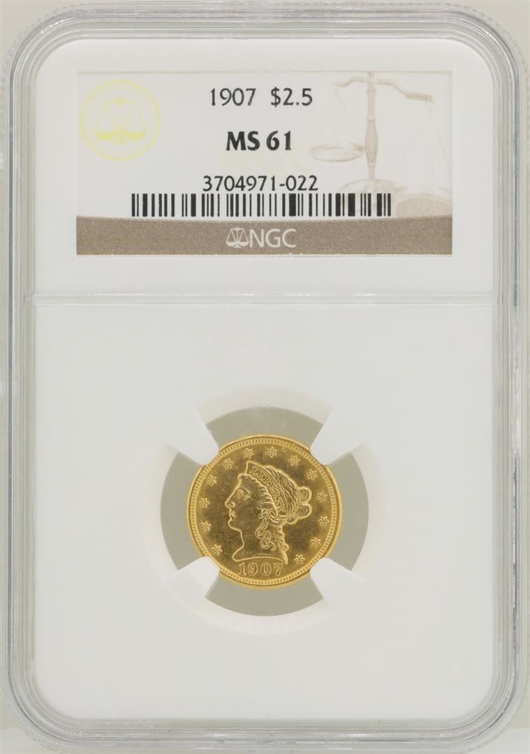 One 1907 $2 1/2 Liberty Head Quarter Eagle Gold Coin NGC MS61. NGC Certified.