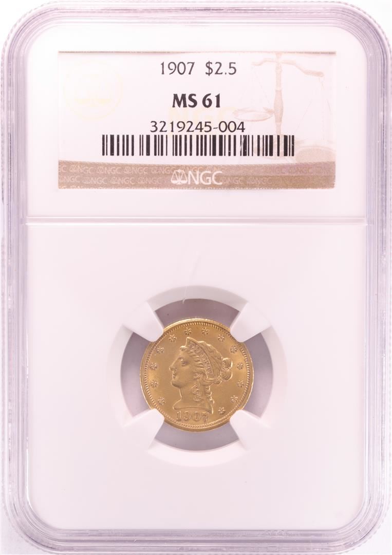 One 1907 $2 1/2 Liberty Head Quarter Eagle Gold Coin NGC MS61. NGC Certified.