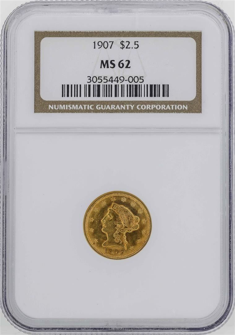 One 1907 $2 1/2 Liberty Head Quarter Eagle Gold Coin NGC MS62. NGC Certified.