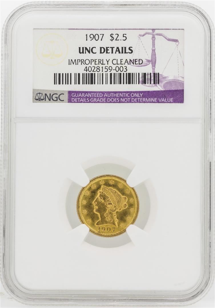 One 1907 $2 1/2 Liberty Head Quarter Eagle Gold Coin NGC Unc Details. NGC Certified.