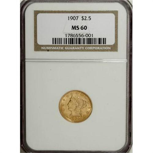<B>1907 $2 1/2 MS60 NGC.</B></I> NGC Census: (62/5830). PCGS Population (142/6931). Mintage: 336,200. Numismedia Wsl. Price for NGC/PCGS coin in MS60: $270. (#7859)<BR><BR><B>Coin Engraver:</B> Christian Gobrecht<BR><BR><b>Shipping:</b> Coins & Currency (<a target="_blank" href="http://www.heritageauctions.com/common/shipping.php">view shipping information</a>)