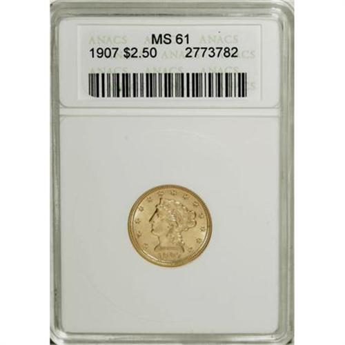 <B>1907 $2 1/2 MS61 ANACS.</B></I> NGC Census: (502/5328). PCGS Population (427/6504). Mintage: 336,200. Numismedia Wsl. Price for NGC/PCGS coin in MS61: $365. (#7859)<BR><BR><B>Coin Engraver:</B> Christian Gobrecht<BR><BR><b>Shipping:</b> Coins & Currency (<a target="_blank" href="http://www.heritageauctions.com/common/shipping.php">view shipping information</a>)