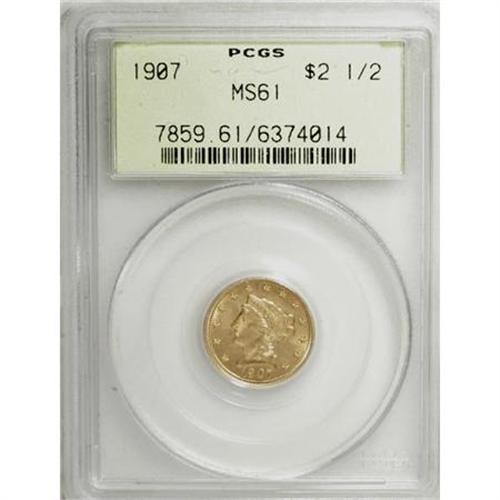 <B>1907 $2 1/2 MS61 PCGS.</B></I> PCGS Population (430/6636). NGC Census: (508/5458). Mintage: 336,200. Numismedia Wsl. Price for NGC/PCGS coin in MS61: $355. (#7859)<BR><BR><B>Coin Engraver:</B> Christian Gobrecht<BR><BR><b>Shipping:</b> Coins & Currency (<a target="_blank" href="http://www.heritageauctions.com/common/shipping.php">view shipping information</a>)