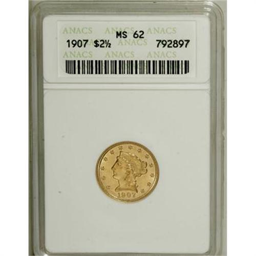 <B>1907 $2 1/2 MS62 ANACS.</B></I> NGC Census: (1324/3958). PCGS Population (1400/5069). Mintage: 336,200. Numismedia Wsl. Price for NGC/PCGS coin in MS62: $455. (#7859)<BR><BR><B>Coin Engraver:</B> Christian Gobrecht<BR><BR><b>Shipping:</b> Coins & Currency (<a target="_blank" href="http://www.heritageauctions.com/common/shipping.php">view shipping information</a>\)