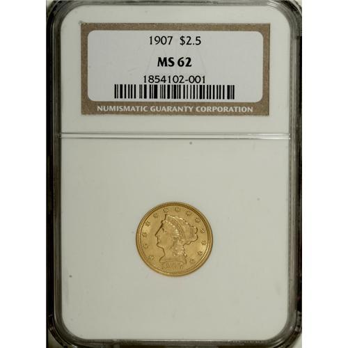 <B>1907 $2 1/2 MS62 NGC.</B></I> NGC Census: (1294/3888). PCGS Population (1382/4985). Mintage: 336,200. Numismedia Wsl. Price for NGC/PCGS coin in MS62: $485. (#7859)<BR><BR><b>Shipping:</b> Coins & Currency (<a target="_blank" href="http://www.heritageauctions.com/common/shipping.php">view shipping information</a>)