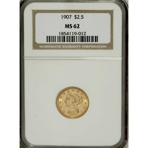 <B>1907 $2 1/2 MS62 NGC.</B></I> NGC Census: (1294/3888). PCGS Population (1387/5019). Mintage: 336,200. Numismedia Wsl. Price for NGC/PCGS coin in MS62: $485. (#7859)<BR><BR><b>Shipping:</b> Coins & Currency (<a target="_blank" href="http://www.heritageauctions.com/common/shipping.php">view shipping information</a>)