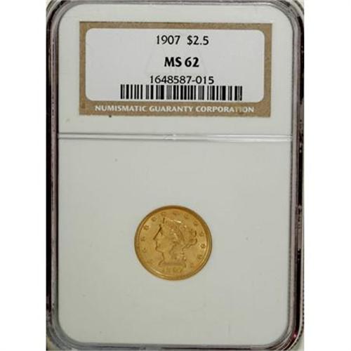 <B>1907 $2 1/2 MS62 NGC.</B></I> NGC Census: (1378/4070). PCGS Population (1412/5224). Mintage: 336,200. Numismedia Wsl. Price for NGC/PCGS coin in MS62: $455. (#7859)<BR><BR><B>Coin Engraver:</B> Christian Gobrecht<BR><BR><b>Shipping:</b> Coins & Currency (<a target="_blank" href="http://www.heritageauctions.com/common/shipping.php">view shipping information</a>)