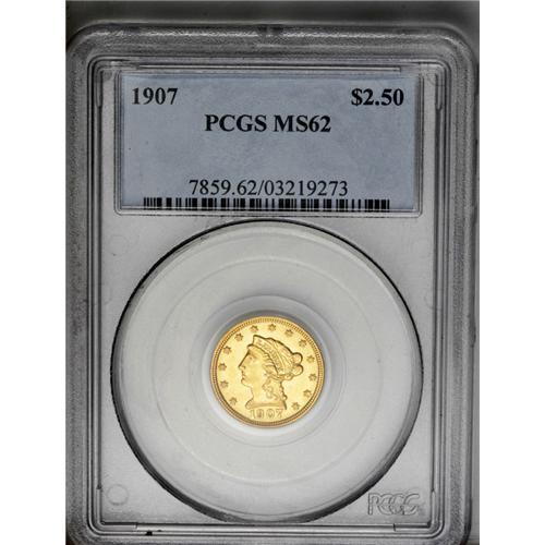 <B>1907<$2 1/2> MS62 PCGS.</B></I> Deep olive-orange toning adorns the bright, satiny surfaces. Well struck and nicely preserved, with a few minute marks that seem minimal, considering the assigned grade of the piece.