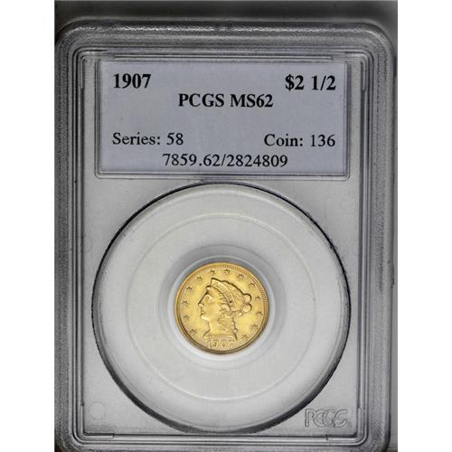 <B>1907<$2 1/2> MS62 PCGS.</B></I> This intricately struck and glossy gold type coin has a splendidly smooth obverse. A moderate mark on the upper reverse field denies a higher grade. The base of the 7 in the date is repunched.